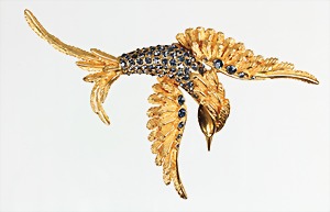 Große, goldfarbene Brosche in Form eines Vogels von P & M (signiert), plastisch geformt und besetzt mit blauen Strasssteinen, 105 x 59 mm