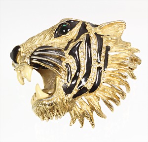Imposante Tigerkopf-Brosche, plastische Ausführung, goldfarbenes Metall mit schwarzer Emaille-Auflage und kleinen, klaren Strasssteinen, signiert mit Patentnummer, ca. 44 x 54 mm