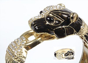 Massiver, schwarzemaillierter Panther-Armreif (unsigniert), goldfarben, mit einem plastisch geformten Panther-Kopf mit klarem Strassbesatz, innen: D = ca. 6 x 4,5 cm