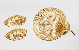 Goldfarbenes Set aus Ohrclips und Brosche von Coro bzw. Corocraft (signiert), USA, florales Design mit kleinen Kunstperlen und winzigen Strasssteinchen, Brosche: 56,5 x 41 mm, Clips: 30,5 x 16,5 mm