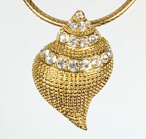Goldfarbene Schlangenkette mit Muschelanhänger von Kenneth Jay Lane (signiert K.J.L.), Anhänger mit klarem Strassbestz, auch als Brosche tragbar, Länge variabel 41 - 48 cm (Verlängerungskettchen)