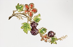 Große, bewegliche Brosche in drei Teilen von Swarovski (mit Schwanenpunze), plastische Ausführung in Form eines Zweiges mit Blättern, Früchten und Blüten, farbige Emaille-Auflage mit Strass- und Kunstperlen-Besatz, 120 x 55 mm