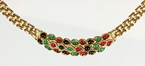 Goldfarbenes Collier, Mittelteil mit farbigen Glastropfen in Rot, Grün und Schwarz besetzt, (unleserlich signiert mit einer Patentnummer), L = ca. 42 cm