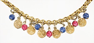 Goldfarbene Erbskette von Louis Feraud, in der Mitte mit zahlreichen Anhängern als blaue und pinkfarbene Glasperlen sowie Logoanhängern, Länge variabel 40 - 45 cm