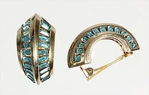 Hell-goldfarbene Ohrclips (unsigniert), Halbcreolen mit hellblauen Baguette-Steinen in zwei Reihen, 27 x 19 mm