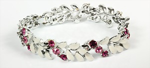 Silberfarbenes Blätterarmband von LISNER USA (signiert), weiß emaillierte Blätter und Strasssteine in unterschiedlichen Pinktönen, L = 17,5 cm