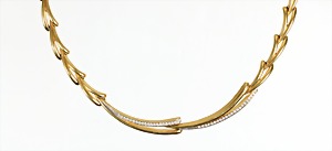 Goldfarbenes Collier von D´ORLAN (Paris), geschwungener Mittelteil mit klarem Strassbesatz, längliche, V-förmige Kettenelemente mit glänzender Oberfläche, L = 40,5 cm