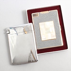 Lot: 1 Benzinfeuerzeug, "EAGLE" 100 KPK, mit Fach für Zigaretten u. kl. Spiegel, Perlmutterintarsien, 11 x 7,8 x x 1,5 cm, Originalschatulle; 1 Benzinfeuerzeug, APPEL & ZAHN A.G., 2 Fächer für Zigaretten, 11,5 x 8,2 x x 1,3 cm