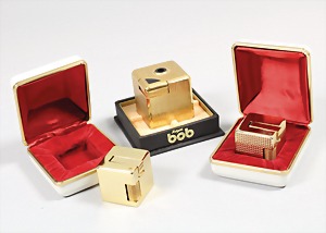 Lot: 3 Gasfeuerzeuge, 2 x kl. Würfel, Oberfläche "Carre", ca. 28 x 28 x 28 mm, 1 x Würfel Royal BOB, ca. 37 x 37 x 37 mm, alle in Originalschatulle