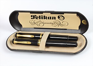 Lot Kolbenfüller "PELIKAN": 1 Füller mit Metallfeder, L = 12,3 cm; 1 Füller mit 585/000 Goldfeder, L = 12,6 cm in orig. Schatulle