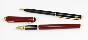 2 Kolbenfüllfederhalter: 1 MONTBLANC MEISTERSTÜCK 144 M, GG/WG 585/000 Feder, sig.: 4810 M 14 c MONTBLANC 585, vergoldete Ringe u. Clip, Korpus: schwarzes Edelharz, L = 13 cm, elegante Form; 1 MONTBLANC No 244 B, GG 585/000 Goldfeder, vergoldete Ringe u. Clip, Korpus: schwarzes Edelharz, L = 12,8 cm, (Ringe teilweise lose)