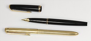 Lot: 3 Kolbenfüllfederhalter, vergoldete Ringe u. Clip, Korpus: schwarzes Edelharz, davon 1 x "PELIKAN" 120 (Kappe lose !), L = 12,5 cm; 1 Drückbleistift (CROSS ?) graviert: SENATOR, L = 13,1; cm; 1 Kuli "CROSS" V 20, MADE IN IRLAND, 10KT GOLD ROLLED, L = 13,3 cm