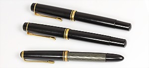 3 Kolbenfüllfederhalter mit GG 585/000 Feder, vergoldete Ringe u. Clip, Korpus: schwarzes Edelharz, 2 x "PELIKAN", L = 12,5 cm; 1 x "KAWECO", L = 12,5cm
