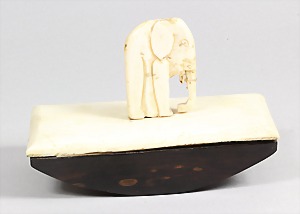 Kolonialer Tintenabroller 1.Hälfte 20.Jhd., Ebenholz (?) mit einer Elfenbeinplatte, 1 Elefant als Abschluß (Elfenbein); L = 12 cm, H = 8,5 cm. Bitte beachten Sie die jeweiligen Einfuhrbestimmungen Ihres Landes, ein Versand ins EU-Ausland ist für diesen Artikel leider nicht möglich !