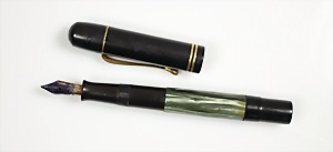 1 Kolbenfüllfederhalter, "PELIKAN" mit GG 585/000 Feder, vergoldete Ringe u. Clip, Korpus: schwarzes Edelharz mit grüner Einlage, L = 11,5 cm