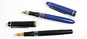 Lot: 1 "PELIKAN" Kolbenfüllfederhalter mit golfarbener Feder, vergoldete Ringe (grav: PELIKAN GERMANY) u. Clip, Korpus: schwarzes Edelharz, L = 12,5 cm; 1 "HANSA" Kolbenfüllfederhalter mit Feder: GOLDPLATED, vergoldete Ringe u. Clip (grav: HANSA), Korpus: blaues Edelharz, L = 13 cm