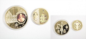 Lot: 2 Papstmedaillen verg., 1 x TIARAP BENEDICTUS XVI, Rückseite mit 4 granatfarb. Steinen, D = 50,3 mm; 1 x LEO XIII P.M. mit farbigem Bildnis, D = 70 mm