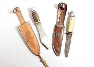 Lot: 1 Wurfmesser mit Lederscheide, "HUBERTUS SOLINGEN", L = total 25 cm (ohne Fransen); 1 Messer "TOM BROX" Solingen mit Horngriff, L = total 24 cm