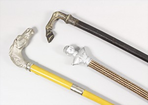 Lot: 3 Reitgerten, 1 x mit Pferdekopf (Handstock), L = 63 cm; 1 x mit Pferdefuß L = ca. 95 cm; 1 x mit Büste (Wehrmacht Knauf !), Inschrift: ES LEBE DER RESERVEMANN, L = 92,5 cm