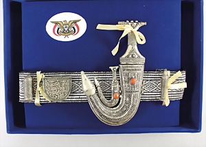 Prunkgürtel mit Krummdolch, ein "EHRENGESCHENK" aus Jemen für hochrangige Diplomaten, Gürtel mit Silberfaden bestickt, 2 Carneolcab. zieren die Messerscheide, Vitrinenkasten mit Sichtglas, Außenmaß: 52 x 36 x 10 cm