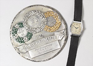 Lot: 1 Herrenarmband-Uhr 2.Weltkrieg, Stahl, Handaufzug, arab. Index, kl. Sek. auf 6 Uhr, Kunststoffglas, gedr. Boden mit Scharnier, Boden graviert: "KREMER Tp.Nr. 35831 E zum Andenken Krieg 1939", B = 25,8 mm, Stoffband mit Dornschließe, Uhr muß gereinigt werden ! 1 Plakette: "So war es, 25 Jahre so ist es, So sol les werden, ZUR SILBERHOCHZEIT, Zur Erinnerung N.S.K.O.V. Abt. Rheinau, D = 12 cm
