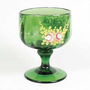 Altes Glas 1900 Jhd. In leuchtendem grün, farbigiges Blumendekor (bemalt), H = 15 cm, D = 11,5 cm