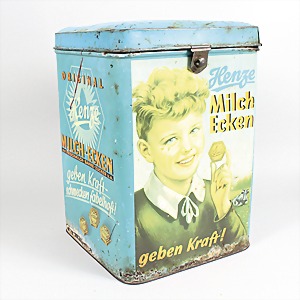 Dose aus den 1940/50er Jahren, ORIGINAL "HENZE" MILCH-ECKEN geben Kraft ! Ca. 27 x 18 x 18 cm (Deckel seitlich eingerissen)