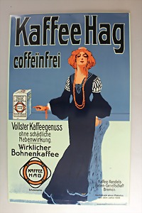 Emailleschild aus den 1960/70er Jahren, "Kaffe Hag coffeinfrei", ca. 70 x 44,5 cm, Nachdruck eines Plakats aus dem Jahre 1908