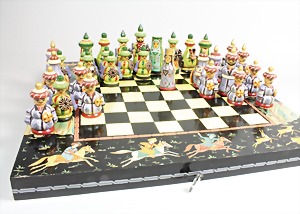 Schachspiel Mitte 20.Jhd., russisch/mongolische Figuren, Kasten mit Reitermotiven, ca. 40 x 20 x 5,8 cm (geschlossen), 1 Läufer mit def. Schild