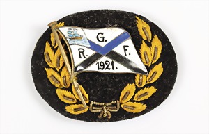 Schiffsabteichen aus den 1920er Jahren, Lorbeerkranz auf Samtkissen gestickt mit einer Flagge aus farbigen Emaille: R. G. F. 1921, ca. 60 x 40 mm