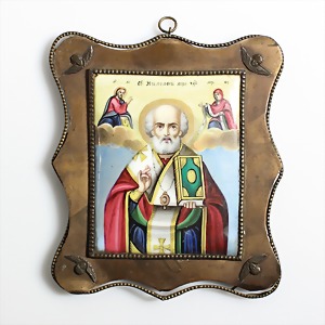 Russische Ikone "HEILIGER NIKOLAUS" 2. Hälfte 19Jhd., fein bemalte Porzelanplatte (frei gemalt), Kupferoklat mit 4 kl. Engelchen verziert, Rückseite mit Samt bezogen, ca. 10,5 x 9,3 cm