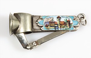 Zigarrenabschneider, DEUTSCH 1.Hälfte 20.Jhd., versilbert, Emaille mit Nürnberger Schriftzug, andere Seite mit emaillierter Stadtansicht, L = 52 mm