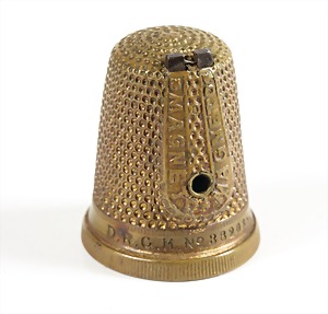 Fingerhut um 1900 mit "MAGNET" !!, Tombak verg., seitliche Signatur/Inschrift: MAGNETO MAGNETO D.R.G.M. No 382084., D = 20 mm u. H = 23 mm