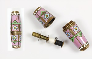 Nähutensil Anfang 20.Jhd., Metall farbig emailliert, aufschraubbar, zerlegt: 1 Fingerhut, 1 Garnrollenhalter u. in diesem integriert ein Fach für Nähnadeln, H = 63 mm, D = 19,7 mm