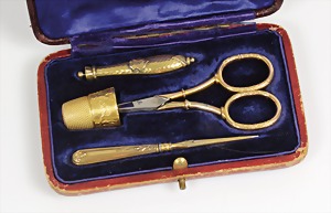 4 teiliges Nähset, Deutsch um 1890, GG 585/000 sig: HB, 1 Nadelbehältnis mit ziselierter Oberfläch, kl. Gravur im Wappen: HJ; 1 Fingerhut mit umlaufendem "KINDERREIGEN" (alte Reparaturstelle); 1 Schere (Stahlschneiden) u.1 kl. Dornnadel/Ahle, dazu passend, eine mit Samt ausgeschlagene Schatulle: ca. 11 x 7 cm