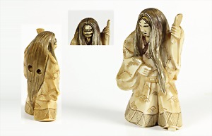 Ältere Elfenbeinfigur mit Wechselgesicht, 1 x BÖSE u. 1 x GUT ! (drehbar), gravierte u. patinierte Oberfläche, H = 63,5 mm, total 43,5 g (Fußspitze fehlt)