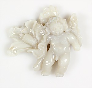 Opal AUSTRALIEN, plastisch geschnittener PUTTO mit Flügeln, hält Blüte im Arm, ca. 43 x 39 mm, total 10 g