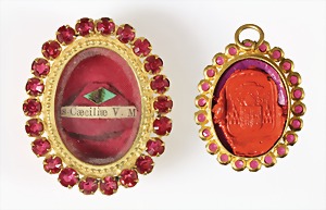 Kleiner Reliquienschrein zum Aufhängen, Anfang 20.Jhd., Metall vergoldet, umlaufender Kranz mit roten Steinen. Rückseitig das Kirchensiegel in roten Lack gedrückt, H = ca. 44,5 mm