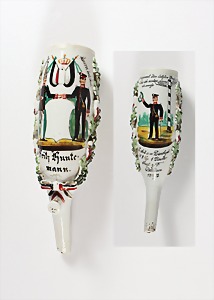 Reservisten-Pfeifenkopf, Porzellan, "Fritz Huntermann", Potsdamm 1910/12, farbig bemalt u. mit Eicheln u. Eichenlaub plastisch verziert, L = 14 cm