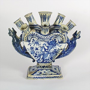 Delfter Tulpenvase, um 1700, Delft, Manufaktur De Metalen Pot unter Lambertus van Eenhorn (1691-1721) oder De Dobbelde Schenckan unter Loueijs Fictorsz (1688-1713), polychrom bemalt, vorne: sitzende Dame mit einem Füllhorn voller Blumen, hinten: ein Meer von Blumen, mittendrin ein Pfau. In den acht versetzten Tüllen kommen die Schnittblumen besonders zur Geltung, seitlich runden 2 Echsen das Bild ab. Alte restaurierte Stellen aus den 1950/60er Jahren (teilweise mit Fehlstellen in Glasur, 2 gebrochene Stellen geklebt), H = 24 cm, B = 25,5 cm, T = 11 cm