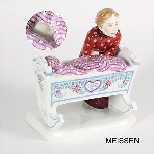 Porzellanfigur MEISSEN, Entwurf "HENTSCHEL" 2.Hälfte 20.Jhd., Mädchen an der Wiege, Neuausformung nach dem Modell U 141 X von 1905, sog. HENTSCHELKIND, farbig bemalt, ca. 15 x 11,5 cm