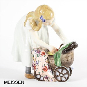 Porzellanfigur MEISSEN um 1910/20, Mädchen mit Puppe u. Puppenwagen, sog. HENTSCHELKIND, Entwurf "KONRAD HENTSCHEL" 1905, Modellnr. W 124, feine farbige Bemalung, ca. 13,5 x 14,5 cm, sammelwürdig !