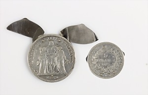 5 FRANCE aus dem Jahr 1875, umfunktioniert zu einem Nagelutensil mit integrierter Nagelfeile u. kleinem Messer (einklappbar !), D = 37,2 mm, skuril !