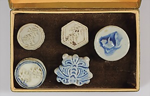 5 alte Chinesische Spielsteine, Porzellan mit polychromer Bemahlung, D = 17,5 - 24 mm