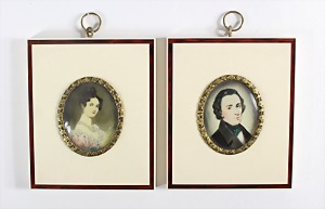 1 Damen- u. 1 Herrenportrait (auf Elfenbein gemahlt), wohl Erbach mitte 20.Jhd., Rahmen elfenbeinfarbener Kunststoff mit brauner Intarsie, ca. 10,5 x 8,7 cm