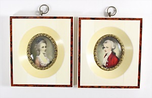 Lot: 1 Damenportrait u. 1 Herrenportrait (auf Elfenbein gemahlt) wohl Erbach mitte 20.Jhd., Rahmen komplett mit Elfenbein ausgelegt, umlaufende Schildpattintarsie ca. 10,5 x 9,4 cm, Darstellung: Mozart u.Konstanze Weber (Mozarts Braut)