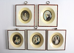 Lot: 4 Damenportraits u. 1 Herrenportrait (auf Elfenbein gemahlt) wohl Erbach mitte 20.Jhd., Rahmen komplett mit Elfenbein ausgelegt, umlaufende Schildpattintarsie ca. 10,5 x 9,3 cm