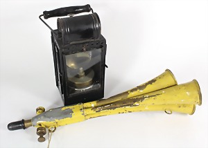 Lot: 1 Bahnlampe mit Henkel, "HEINRICH GILLET EDENKOBEN" 19052, schwarze Emaillefarbe, H = 21,5 cm (ohne Henkel); 1 Signalhorn DB 80, "MARTIN SIGNAL" 4-Klang L = 40 cm, gut gebraucht !