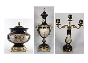 Lot: Frankreich, "Tischensemble", Messing teilvergoldet, A.C.F. Decor bleu Sèvres fait a la main, 1 Pokal, 3-armiger Kerzenleuchter H = 38,5 cm, 1 Deckel-Schüssel D = 22 cm, romantische Szenen u. farbige Blumen zieren die Objekte, sie werden von goldfarbenen Girlanden eingerahmt