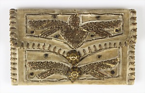 Geldbörse um 1800, samtartiger Stoff auf Leinen, mit Goldfäden bestickt (u.Pergament unterlegt), innen ein separates Fach für den Notgroschen, 2 geprägte Knöpfe dienen als Verschluß, 91,5 x 55 mm